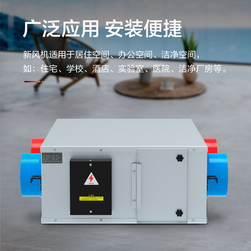 雙向流新風機具有獨立的排風及送風系統,受污染的空氣經排風口、排風管道及排風機排至室外,室外的新鮮空氣則通過送風機、送風管道和送風口送入室內。