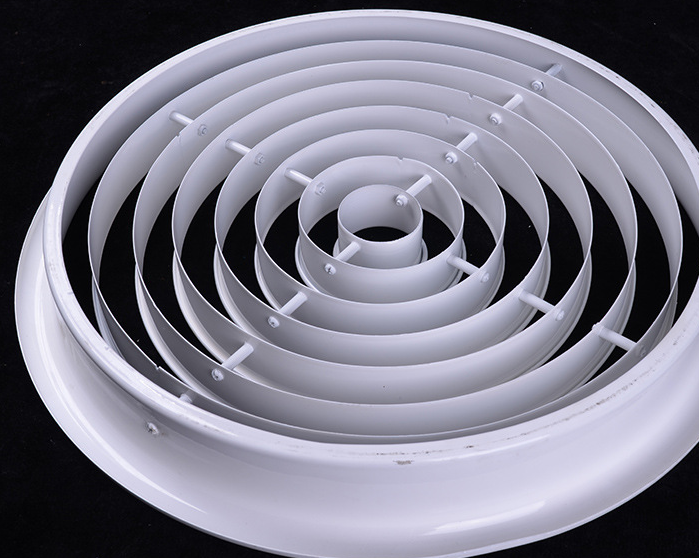圓環形散流器一般用于人員活動范圍有較大距離的場合,如電影院會展中心、體育館、工廠等。采用最佳空氣動力學原理設計的多層環形結構,具有阻力低射程遠、噪音低等特點,外框固定后,內環葉片可根據冬夏季節不同的氣流組織進行上下45度轉動。