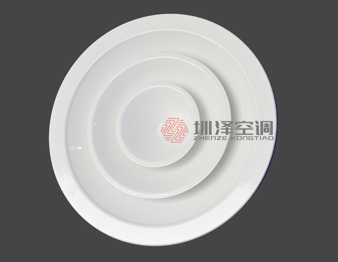 圓形散流器一般用于冷暖送風。通常安裝在頂棚上。其吹出氣流呈貼附(平送)型,其結構為多層錐面形。由于室內誘導氣流大于排風量,因此吹出氣流減速較快。因此相對任意大小面積來說可以供給較大風量,而且在給定的風量范圍內擴散半徑的大小變化.